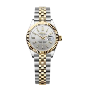 Son cadran marron chocolat orné d’index diamantés offre un éclat subtil, rehaussé par la lunette cannelée or rose et le bracelet jubilé bicolore en acier 316L et or rose poli.