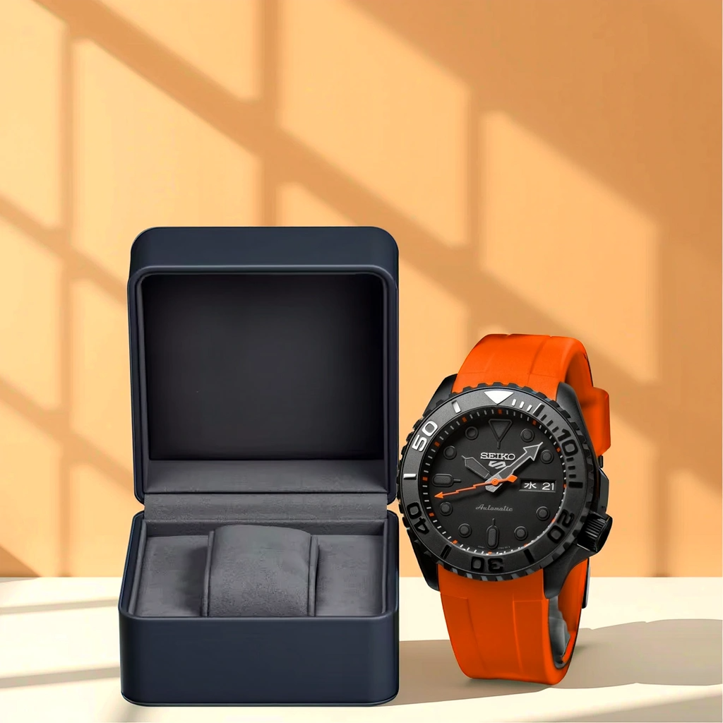 La Seiko Mod Submariner – Orange KX impose son style par un contraste saisissant entre son bracelet orange intense et son boîtier noir mat.